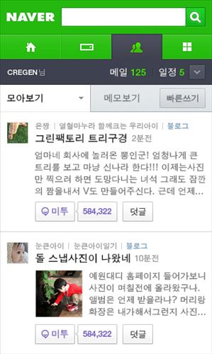 네이버는 모바일 메인 페이지를 통합 메인 페이지 외에 검색어 서비스, 모바일 웹 네이버me, 네이버 전체서비스 등 총 4개 영역으로 구분, 이용자들이 메인 페이지에서 한 번의 터치만으로 다양한 서비스를 이용할 수 있도록 했다.