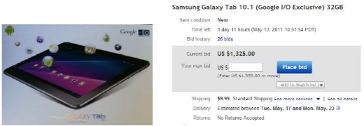 'Samsung Galaxy Tab 10.1 (Google I/O Exclusive) 32GB'라는 제목으로 올라온 이 글에서는 '갤럭시탭 10.1' 32GB 버전의 가격이 1,325$로 책정됐다. 현재 이베이에는 이 글 이외에도 '갤럭시탭 10.1' 판매에 관한 글이 60개 이상 올라와 있는 상태다.