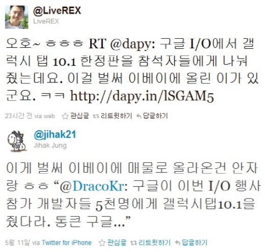 이는 삼성이 구글 I/O(Innovation in the Open)컨퍼런스에 참여한 개발자들에게 5천대의 갤럭시탭 10.1 한정판을 무료로 제공했던 것에 기인한다. 안드로이드 애플리케이션 개발자들에게 '갤럭시탭 10.1'용 앱 개발을 독려하기 위해 나눠줬던 제품들을 개발자들이 이베이에 내놓은 것.