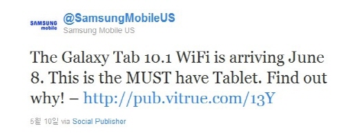 삼성전자의 미국 내 공식 트위터에 따르면 '갤럭시탭 10.1' WIFI 버전의 미국 출시일은 6월 8일이다.