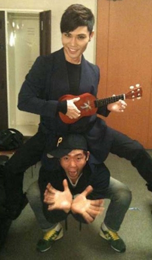 사진 속 김범수는 기타를 손에 든 채 짙은 화장을 한 얼굴에 사악한 미소를 띄우며 한 남자를 깔고 앉았다.