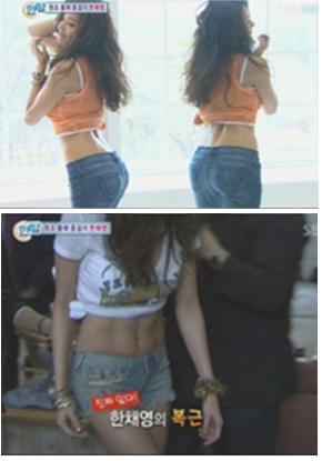 이날 방송에서 한채영은 핫팬츠와 데님 재킷을 걸치고 화보촬영을 해 뛰어난 몸매를 과시했다.