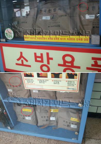 ▲지난 5월12일 서울지하철의 또 다른역에 비치된 국민방독면은 '화재시 사용금지'란 표시 없이 화생방용 사용법만 부착됨.