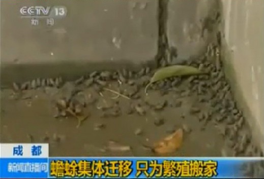 중국 쓰촨성 성도 청두에서 두꺼비 떼 수만마리가 이동행렬을 보이고 있어 이에 따른 불안감이 조성되고 있다.