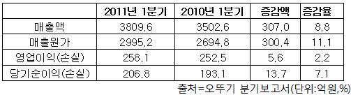 지난해 1분기 562억원에 불과했던 참기름 및 식용유지 매출은 올해 702억원으로 140억원(24.9%) 이나 급증했다. 참기름 시장점유율(AC닐슨 자료·2011년3월31일 기준)은 1년만에 41.3%에서 53%로 11.7% 껑충 뛰어올랐다.