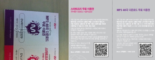 19일 서울시 서초구 반포동에 거주하는 황 모(남.30세)씨에 따르면 그는 2주전 모 커피점문점에서 케익을 구매한 후 CJ 원카드에서 발매한 'MP3 40곡 다운로드 무료 이용권'을 받았다.