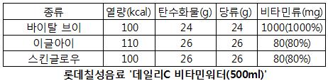 롯데칠성음료의 신제품 '데일리-C 비타민워터'는 바이탈 브이, 이글아이, 스킨글로우 등 3가지로 각각 비타민C함량, 블루베리 추출물, 콜라겐과 히알루론산 첨가여부에 따라 제품화됐다. 이 제품의 경우 1병(500ml)의 열량은 100~110kcal, 비타민류 함량도 80~1000mg로 각기 다르다.