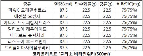 19일 관련업계에 따르면 코카콜라음료의 '글라소 비타민워터'는 7가지 맛이 나와 있다. 파워C, 에센셜, 에너지, 멀티브이, 다운로드, 리스토어, 트리플X 등은 1병(500ml)의 열량이 87.5kcal, 비타민C 함량 75mg(1일 권장량의 75%)으로 동일하다.