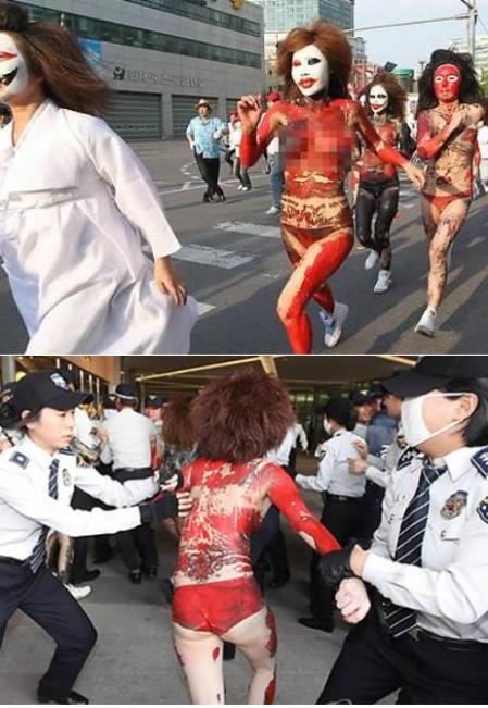 지난 17일 오후 서울 영등포 타임스퀘어 앞에서 집장촌 성매매 여성들이 온몸에 붉은 물감을 칠하고 팬티만 입은채 시위를 벌이고 온몸에 휘발유를 붓는 등 분신을 시도했다.