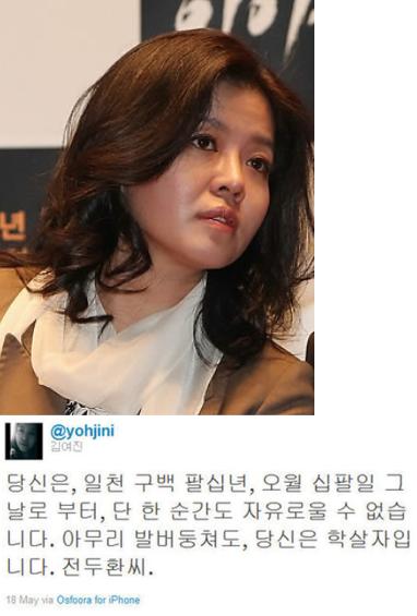 김여진은 지난 18일 자신의 트위터에 “당신은, 일천 구백 팔십년, 오월 십팔일 그날로 부터, 단 한 순간도 자유로울 수 없습니다. 아무리 발버둥쳐도, 당신은 학살자입니다. 전두환씨”라는 글을 남겼다.