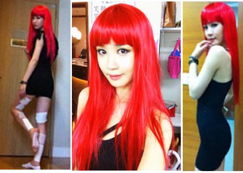 사진 속 이다해는 빨간 머리에 블랙 미니 드레스를 입고 다리엔 온통 파스를 붙이고 있다.