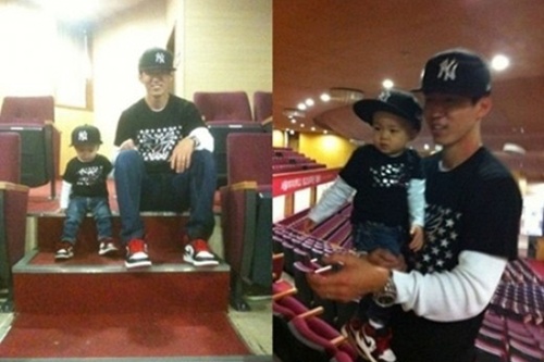 사진 속 하율군은 아빠와 나란히 앉아 똑같은 힙합 스타일 옷과 모자, 운동화를 착용하고 있었다. 검은색 상의에 빨간색 운동화 끈으로 포인트를 줘 센스가 돋보였다.