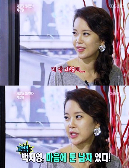 백지영은 지난 21일 '연예가중계'의 게릴라 데이트에 출연한 백지영은 외롭지 않느냐는 리포터의 질문에 "마음에 둔 남자가 있어 외롭지 않다'라고 고백해 이목을 끌었다.