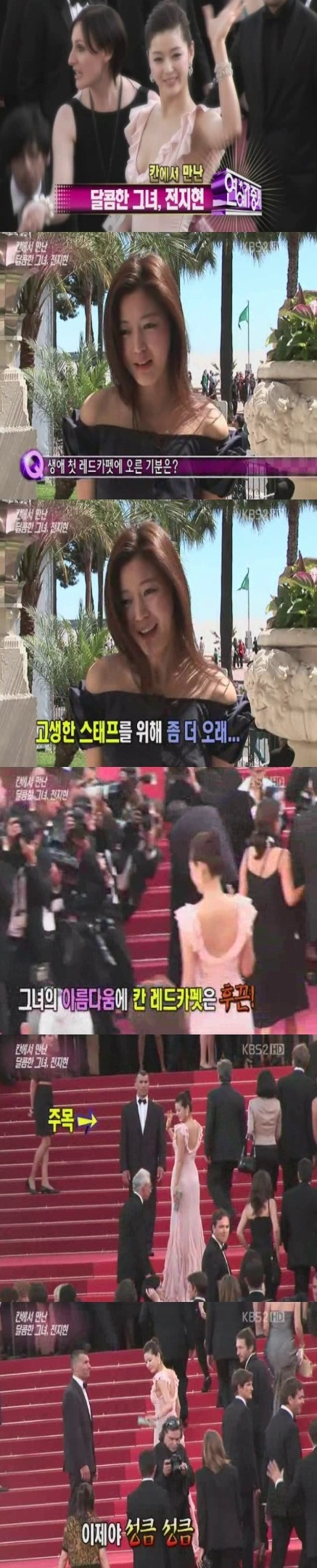 5월 21일 방송된 KBS 2TV ‘연예가중계’에서는 칸에 입성한 전지현을 만나 데이트를 즐겼다. 전지현은 이날 방송에서 레드카펫 입성 시 겪은 에피소드를 털어놨다.