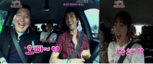 또 강호동이 여배우특집 때문에 "전날 밤 한숨도 못 잤다"고 말하자 최지우는 "저도요! 설레서요"라고 애교를 부려 운전을 하던 이승기 마저 웃게 만들었다. (사진=KBS 방송 캡처)