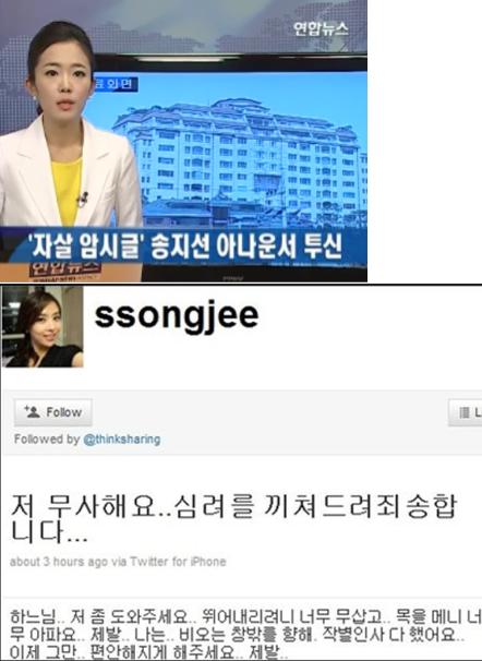 송지선 아나운서는 지난 6일 새벽 트위터에 "저를 데려가주실 수 없다면 힘을 주세요. 너무 고통스럽습니다"라는 글에 이어 "하느님 저 좀 도와주세요. 뛰어내리려니 너무 무섭고 목을 매니 너무 아파요. 비오는 창밖을 향해 작별인사 다 했어요. 이제 그만 편안해지게 해주세요. 제발"이라는 자살 암시글을 올려 119가 출동하기도 했다. (사진=연합뉴스 영상 캡처, 송지선 아나운서 트위터)