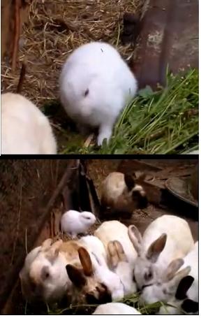 이 영상에는 귀가 없는 하얀 털의 토끼가 귀가 있는 다른 토끼들 사이에서 풀을 먹고 있다.