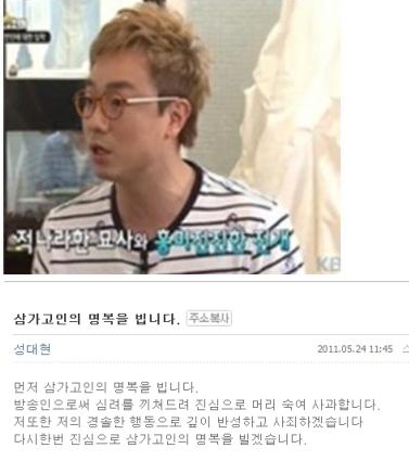 성대현은 24일 오전 자신의 미니홈피 게시판에 "먼저 삼가 고인의 명복을 빕니다. 방송인으로서 심려를 끼쳐드려 진심으로 머리숙여 사과합니다. 저또한 저의 경솔한 행동으로 깊이 반성하고 사죄하겠습니다"라는 글을 올렸다.