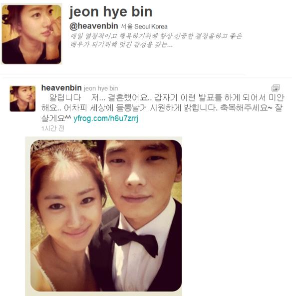 전혜빈은 24일 오후 자신의 트위터를 통해 "저 결혼했어요. 갑자기 이런 발표를 하게 돼 미안해요. 어차피 세상에 들통날거 시원하게 밝힙니다. 축복해주세요. 잘 살게요"라는 글과 함께 사진을 공개했다.