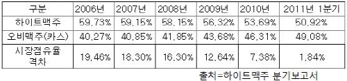 하이트맥주는 올 1분기 보고서를 통해 지난 1월부터 3월까지 맥주 시장점유율(출고자료 기준)이 50.92%로 집계됐다고 밝혔다. 지난 2006년보다 약 9%포인트나 떨어진 수준이다.
