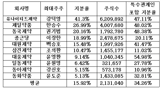 26일 소비자가 만드는 신문이 매출 순위를 기준으로 상위 10개 제약사의 1분기 결산 보고서를 분석한 결과 제약사 오너들의 평균 지분율은 15.92%이며 보유한 주식수는 213만1천40주로 나타났다.