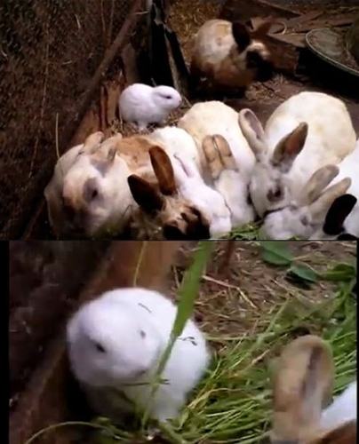 해당 동영상은 정상 토끼 사이에서 풀을 뜯고 있는 귀 없는 토끼의 모습을 약 2분간 보여준다.