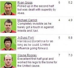 공을 자주 잡지 못해 영향력이 제한적이었다는 것. 맨유는 득점을 올린 루니만 7점을 받았다.
