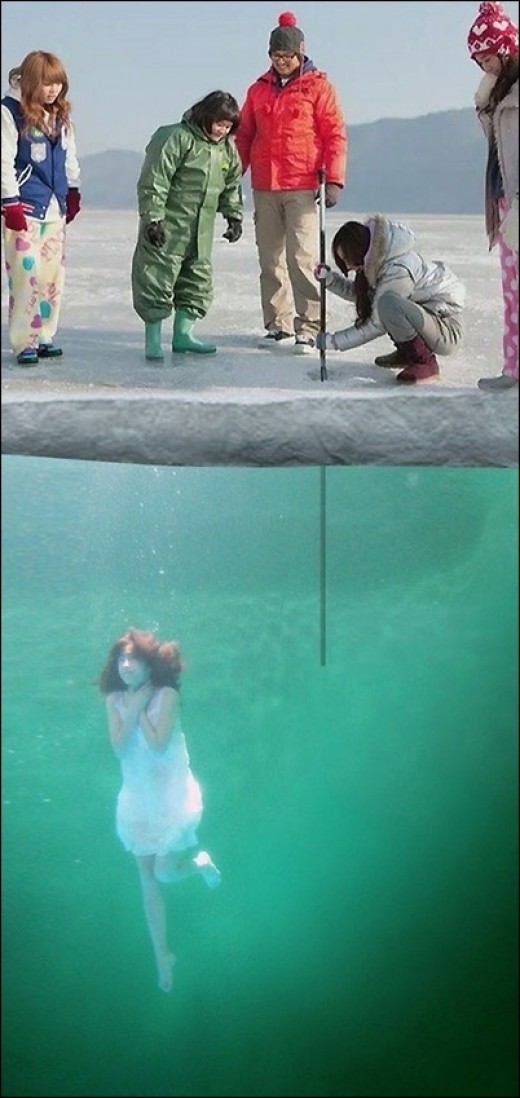 사진 속에서 구하라는 단단한 얼음 사이에 막대기를 넣고 있으며, 물에 빠진 효민을 구하기 위한 것으로 보여 웃음을 선사한다.