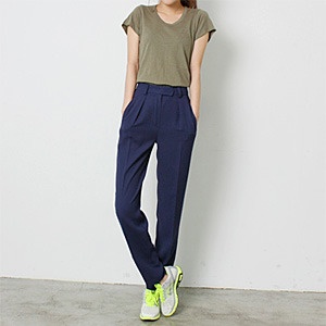 허벅지는 여유 있고, 아래로 가며 좁아지는 디자인으로 본인의 체형에 만족하지 못하는 여성분들도 손쉽게 구애정 스타일에 도전할 수 있다. 깔끔한 스타일이지만 주머니에 레드 스티치 포인트로 디테일도 살아있고, 앞뒤에 핀턱 다트를 잡아주어 활동성을 살렸다.