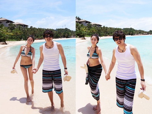 진정한 여름 커플룩의 완성은 커플수영복으로 완성된다. 여성비키니에 남성 팬츠의 색감이나 무늬를 맞춰서 입어주면 센스 있는 커플 수영복으로 연출할 수 있다.