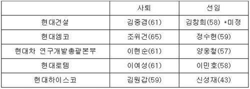 작년 연말에는 현대로템 이여성(61) 부회장과 현대하이스코 김원갑(59) 부회장이 일선에서 물러났다.