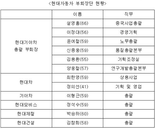 이에 따라 현대차그룹 부회장단은 14명에서 12명으로 줄었다. 중국사업총괄 설영흥(66) 부회장과 현대제철 박승하(60) 부회장만 60세가 넘는다.