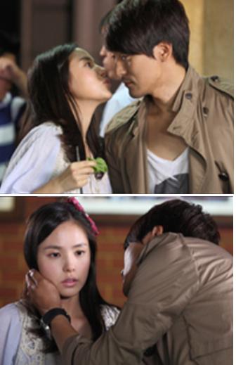 지난 27일 KBS 수목극 '로맨스 타운' 촬영에서 김민준(영희)와 민효린(다겸)이 '상추쌈 키스'를 선보였다.