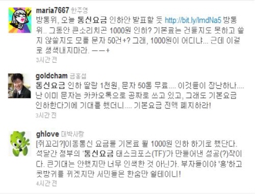 트위터 아이디 'ghlove'는 "석 달간 정부의 통신요금 태스크포스(TF)가 만들어낸 성공작"이라고 비꼬며 "큰 기대는 안 했지만 너무 인색한 것 아니냐"고 목소리를 높였다.