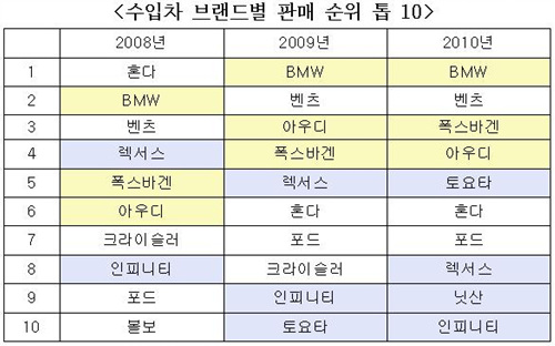 2008년 5, 6위던 아우디와 폭스바겐은 2009년 3, 4위에 올랐으며 작년에는 두 브랜드간 자리만 바꿨다.