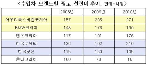 BMW코리아는 최근 3년 동안 148억원, 176억원, 199억원으로 광고 선전비를 12~16% 꾸준히 늘려 2009년과 2010년 2년 연속 판매 1위 자리에 올랐다.