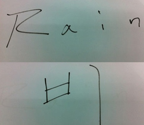 비가 올린 싸인은 한글 '비'와 영문 'Rain'만 쓴 싸인으로 간략하다.