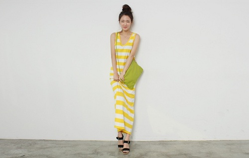 무릎 밑으로 길게 떨어지는 스커트 단은 그 동안 하체에 자신이 없어 원피스 연출을 피해왔던 여성들의 체형도 보완해주어 자신감을 채워준다. 소매와 넥 라인은 스트라이프 색상에 맞추어 깔끔한 느낌을 살려준다. 이런 맥시 원피스는 박시한 숏 티셔츠와 레이어드하면 캐주얼하면서 스타일리쉬한 느낌을 연출할 수 있으며, 가볍게 가디건이나 쉬어한 코트와 코디하면 여성스러우면서 로맨틱한 스타일을 연출 할 수 있다.
