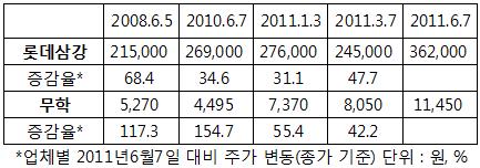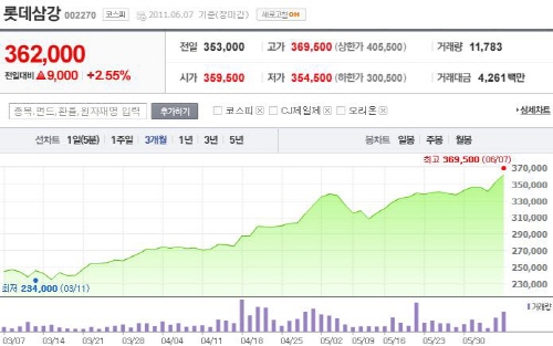 롯데삼강 주가는 지난 1월3일 27만6천원에서 7일 종가기준 36만2천원으로 8만6천원(31.1%) 올랐다. 빙과류 성수기인 여름을 앞두고 최근 3개월 사이에는 무려 11만7천원(47.7%)이나 급등했다.