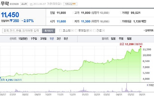 무학의 경우 지난 1월3일 7천370원에서 6개월만에 1만1천450원으로 4천80원(55.4%)으로 수직 상승했다. 1년 전(4천495원)에 비해서는 무려 154.7% 급등한 셈이다.