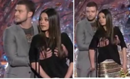 가수 저스틴 팀버레이크와 모델 출신 배우 밀라 쿠니스가 무대 위에서 화끈한 스킨십을 선보였다.