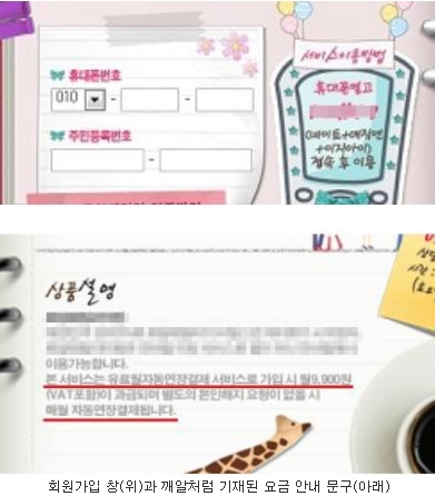 이름, 휴대폰번호, 주민등록번호 등의 개인정보를 입력하고 회원가입 버튼을 클릭하려는 순간, 화면 하단에 보이는 문구는 다름 아닌 결제 안내 문구였다. 글자 크기가 작을 뿐더러 희미해서 잘 보이지도 않았다.