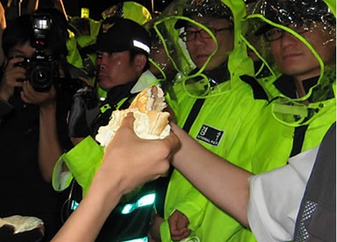 시위 현장에서 대학생들이 경찰들에게 햄버거를 나눠주는 상황이 벌어진 것에 대부분의 경찰들이 모욕감을 느꼈다며 햄버거를 거부했다. (사진=연합뉴스)