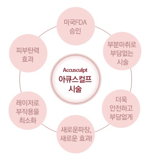 피부 진피층의 콜라겐을 자극하여 피부의 탄력 효과도 함께 볼 수 있다. 지방에만 작용하는 아큐스컬프의 특징으로 그간 시술이 어려웠던 미세지방(옆구리, 팔뚝, 복부, 종아리, 브래지어 라인)과 안면지방(볼살, 팔자주름, 턱살, 이중턱, 볼살처짐)에도 효과적으로 작용하여 마취 없이 흉터 없이 30분만에 완벽한 V라인과 S라인을 완성할 수 있다.
