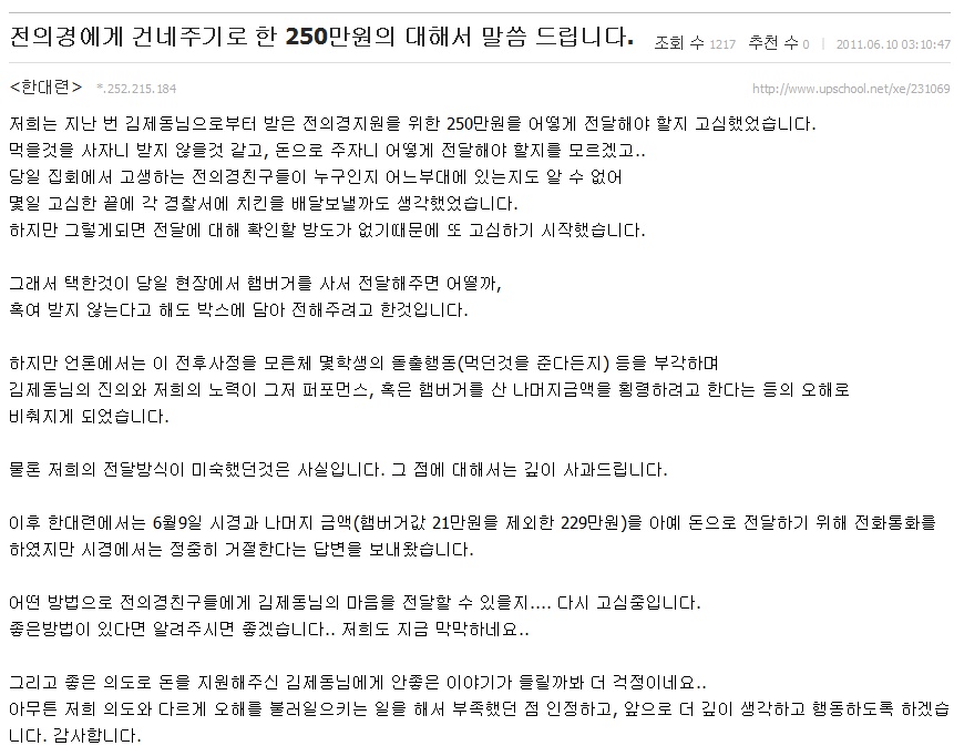 이어 한대련은 좋은 의도로 돈을 지원해준 김제동에게 안좋은 이야기가 들릴까봐 걱정이라며 의도와 다르게 오해를 불러일으키는 일을 해서 부족했던 점 앞으로 더 깊이 생각하고 행동하겠다고 거듭 사과의 말을 전했다.
