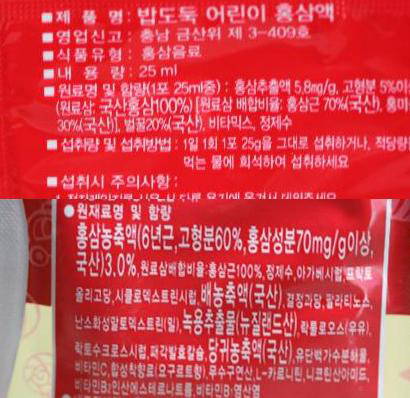 반면 밥도둑 어린이 홍삼액을 보면 원료가 참 단순합니다. 무엇 하나 뺄 것이 없는 엑기스만 담았네요. 어떤 것이 좋다고 할 수 있는 전문가는 아니지만, 엄마 입장에서 우리 아이에게 무엇을 먹여야할지 답이 나옵니다.