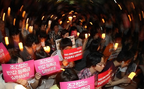 URL복사 기사공유하기 스크랩 프린트 메일보내기 글씨키우기 10일 청계광장에서 반값등록금 실현 국민촛불행동 집회가 열리고 있다. 한 때, 시민들과 학생들은 경찰들에게 햄버거를 나눠주는 등 이색적인 모습으로 열기를 돋운 바 있다. (사진=연합뉴스) 저작권자 © 소비자가 만드는 신문 무단전재 및 재배포 금지 온라인 뉴스팀 다른기사 보기 URL복사 기사공유하기 주요기사 NH투자증권, 3150억 원 규모 모험자본 선제적 투자...‘생산적 금융’ 동참 넷마블, ‘나혼렙: 어라이즈 오버드라이브’ PC·콘솔 글로벌 출시 정윤경 경기도의회 부의장, 미국산 소고기 무관세 전환에 우려 표명 에코팜랜드 화성에 개소...김동연 지사 "17년 만의 결실, 대한민국 축산의 새로운 전기" 100조 투자 유치 초과 달성한 김동연 지사, "화성국제테마파크 화룡점정" 대방산업개발, '시흥거모지구 대방 엘리움 더 루체Ⅰ·Ⅱ' 1순위 청약 시작
