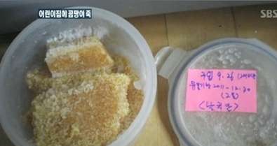 곰팡이죽에 이어 유통기한도 알 수 없는 전복과 날치알까지 있어 보는 이들을 경악케 했다.