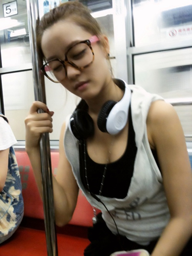 사진 속 고우리는 지하철 손잡이를 잡고 몸을 기댄채 잠들어 있다.