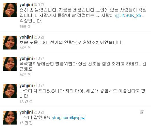 김여진은 12일 자신의 트위터에 “나오다 잡혔습니다. 저와 다섯, 해운대 경찰서로 이송된다고 합니다. 폭력혐의 등에 관한 법률위반과 집단 건조물 침입 죄라고 합니다. 긴급체포”라는 글을 게재했다.